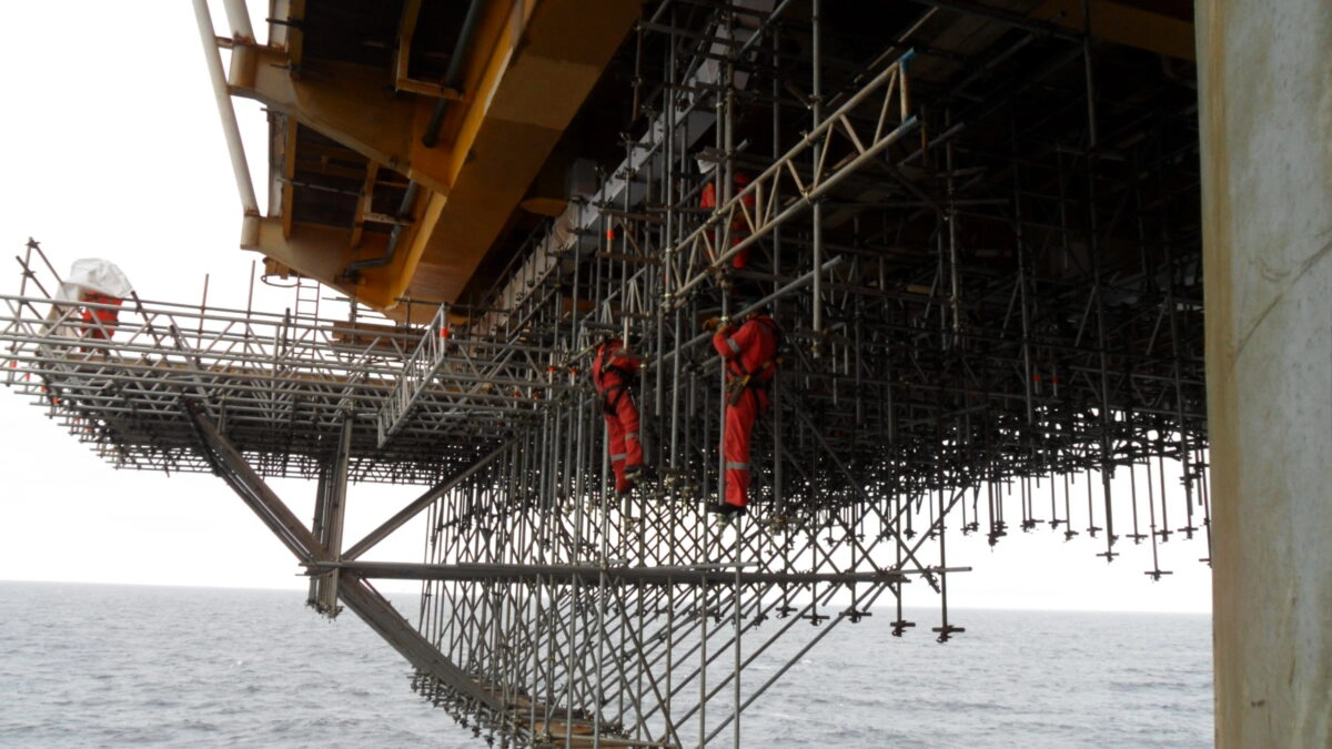 Hanging, Cantilevered access was required for inspection and repair of existing steelwork. The combination of 450 deep aluminium beams and bracing was used to triangulate the loads into ties at steelwork locations. A well constructed job built in testing conditions exactly to design